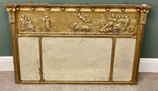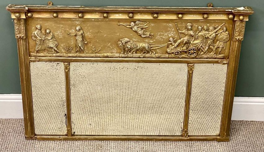 19TH CENTURY GILT FRAMED OVERMANTEL MIRROR, frieze of classical figures over the three plates, 73 x 110cmsProvenance: private collection Conwy