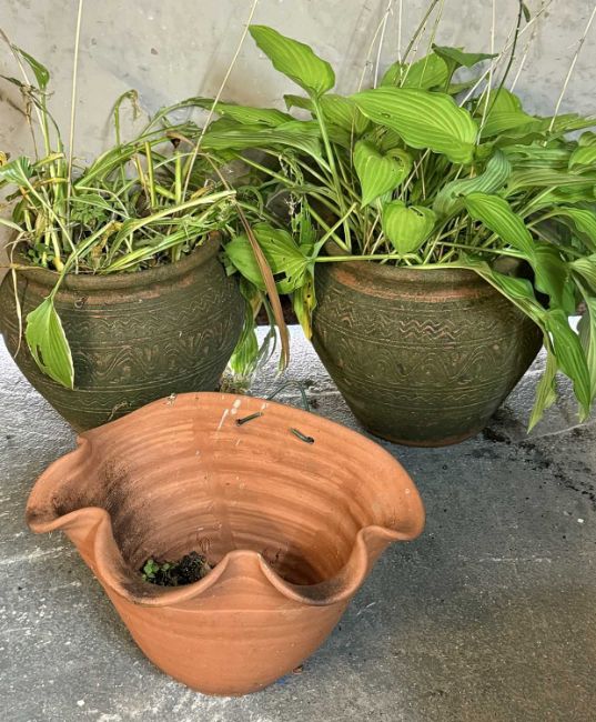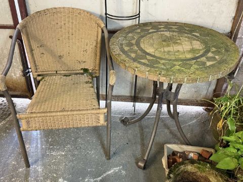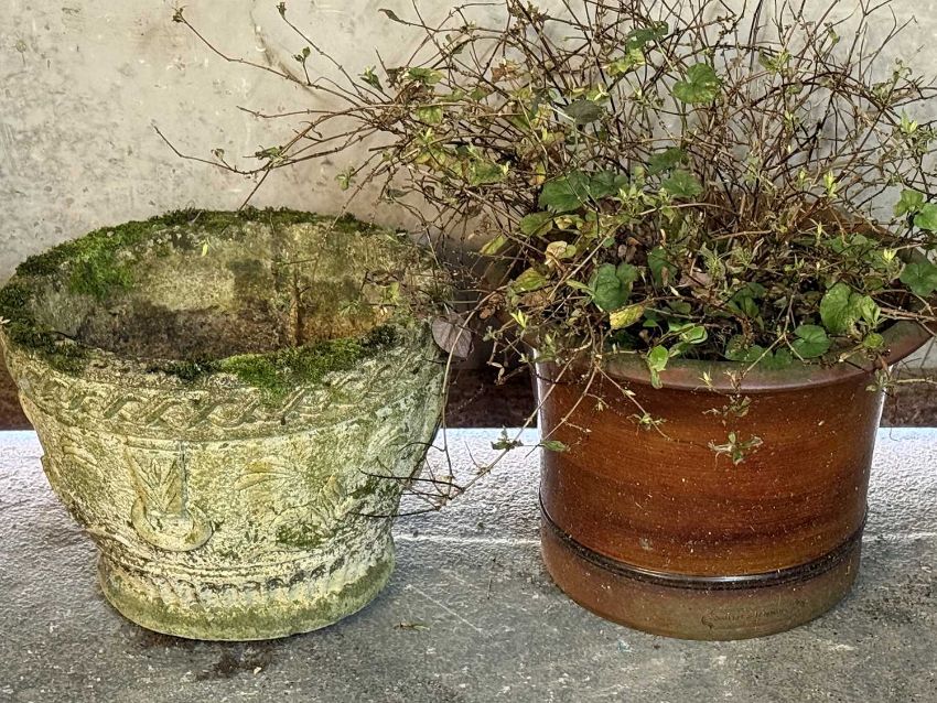 GARDEN EFFECTS including octagonal stoneware pig trough, various planters and contents, circular garden table and rattan style chairProvenance: private collection Ynys Môn