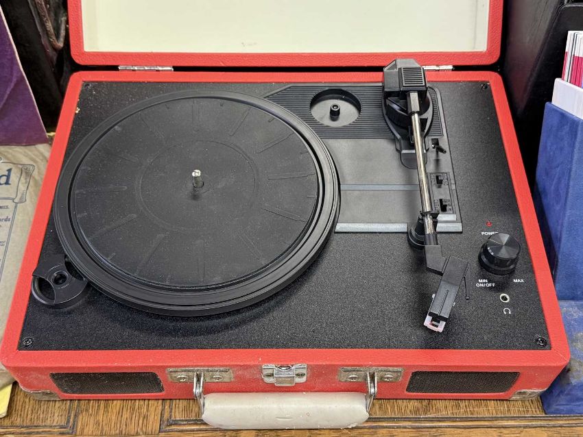 LARGE COLLECTION OF LP & SINGLE RECORDS, various genres including 60s and 70s rock, rock and roll, and pop, with a Crosley portable record playerProvenance: private collection Gwynedd