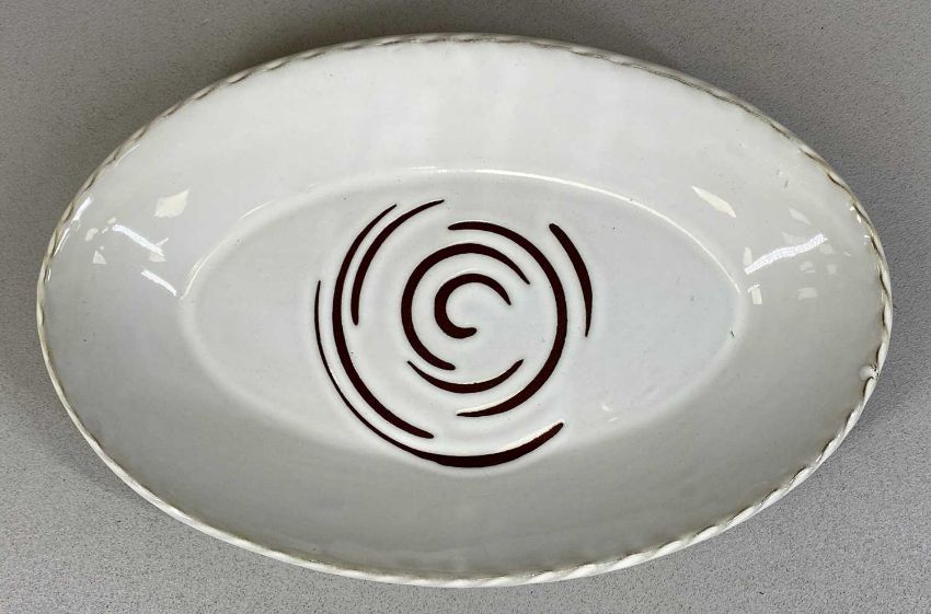 STEPHEN PEARCE, CORK OVAL STUDIO POTTERY DISH, white glazed with blue swirled pattern and crimped border, 37 x 24cmsProvenance: private collection Conwy