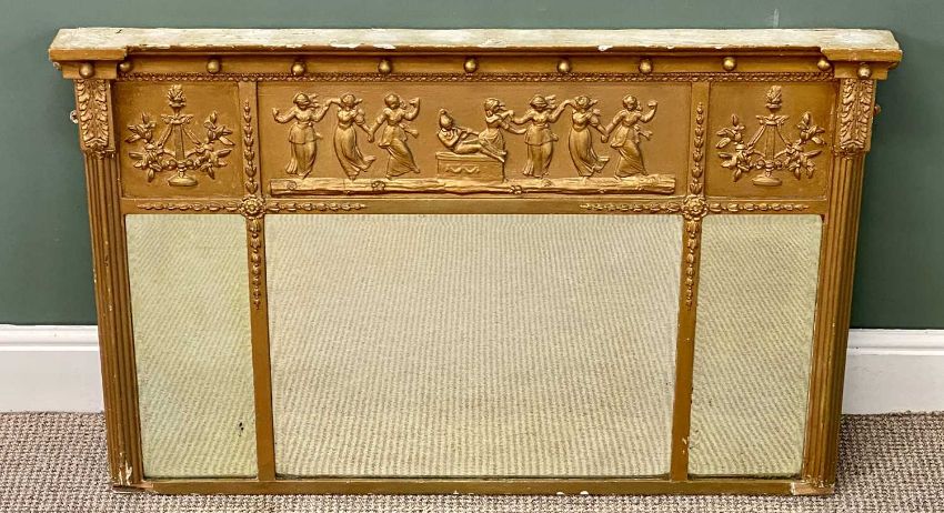 19TH CENTURY GILT FRAMED OVERMANTEL MIRROR, frieze of classical figures over the three plates, 71 x 109cmsProvenance: private collection Conwy