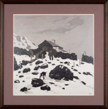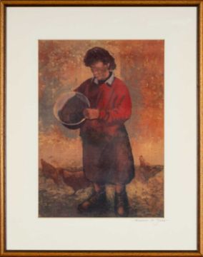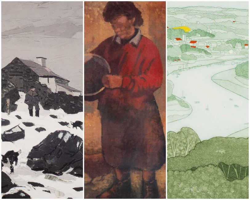 ‡ JOHN BRUNSDON (1933-2014) limited edition (93/150) aquatint engraving - Cardigan, signed, titled and numbered in pencil, 34 x 43cms; together with ANEURIN JONES colour print of a farmer feeding chickens, signed on the mount in pencil, 48 x 28cms; and KYFFIN WILLIAMS colour print of Farmer and Dogs in snow, 37 x 37cms (3)Provenance: private collection BerkshireComments: all framed & glazed.