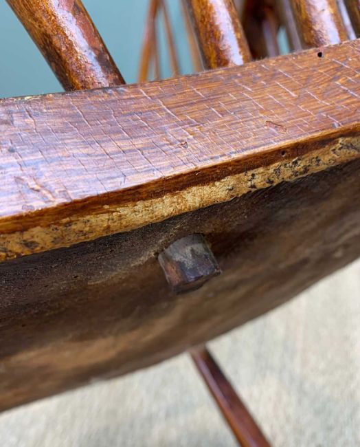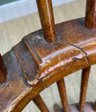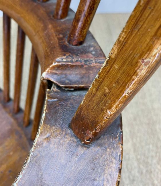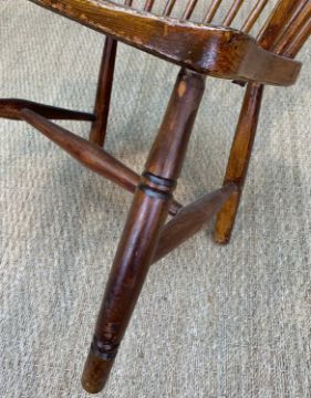 19TH CENTURY HIGH-BACK PROVINCIAL WINDSOR CHAIR, probably Welsh, 110 (h) x 69cms (w)Provenance: private collection Vale of GlamorganComments: over-painted & stained, traces of original paint, front legs and stretcher replaced, arm-rail with splits, framework generally loose, inspection advised