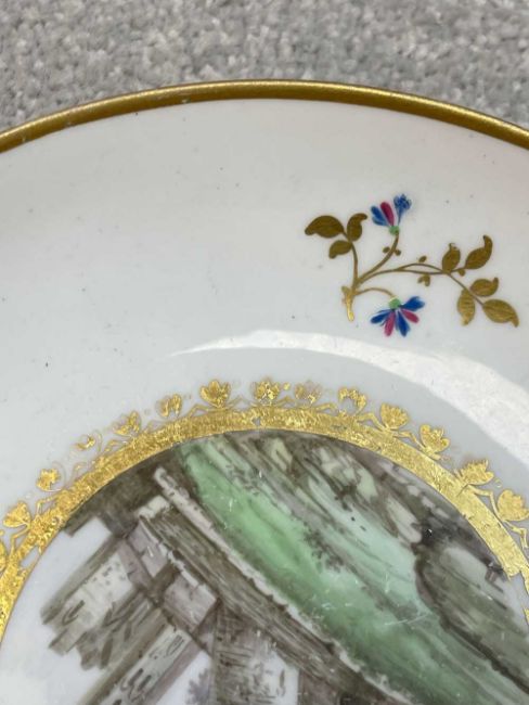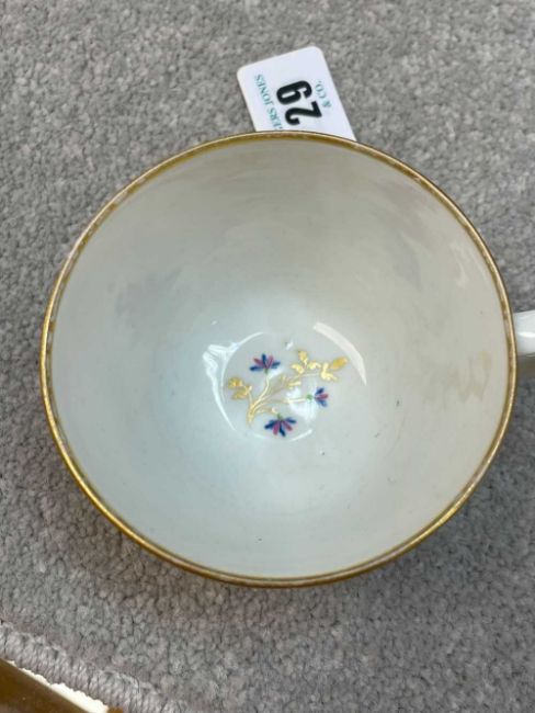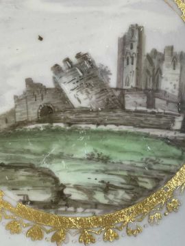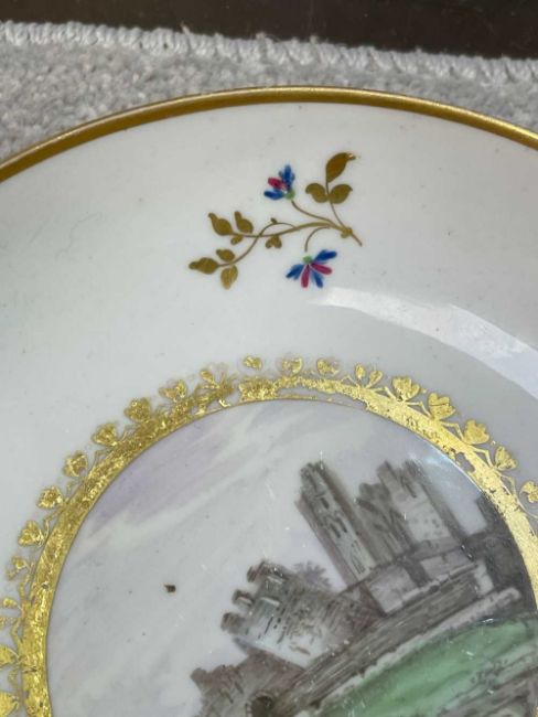 PINXTON TEACUP & SAUCER, early 19th century, bute shape, cup painted with a titled view of Gunnersbury, Middlesex, saucer with a titled view of Caerphilly Castle, Glamorgan, both with additional numerals 221, borders with gilt and enamel cornflowersProvenance: private collection BridgendComments: gilt rubbed