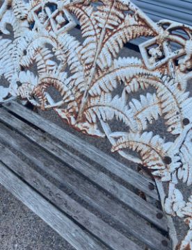 VICTORIAN COALBROOKDALE CAST IRON GARDEN BENCH, Fern & Blackberry pattern, 85 (h) x 118cms (w)Provenance: private collection Vale of GlamorganComments: garden weathered and heavily painted, some slats weak suggest replacement, inspection advised, heavy, no cracks visible, unable to see any makers mark or serial number given the age and paint