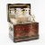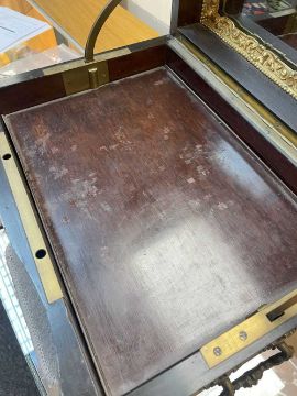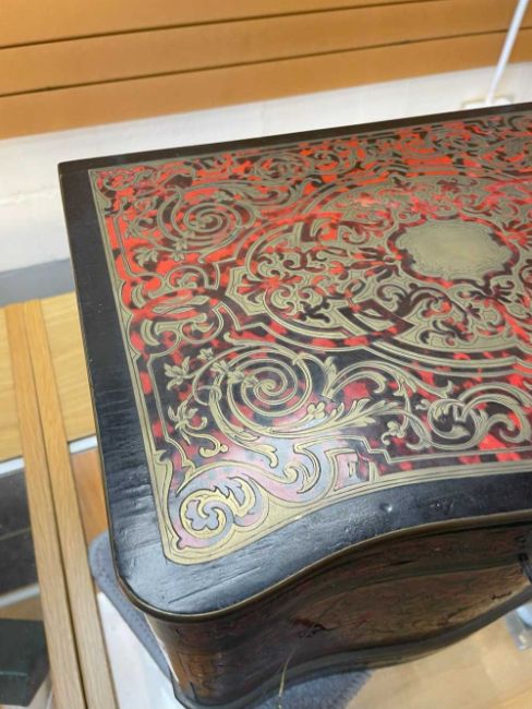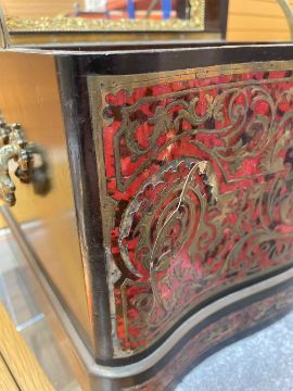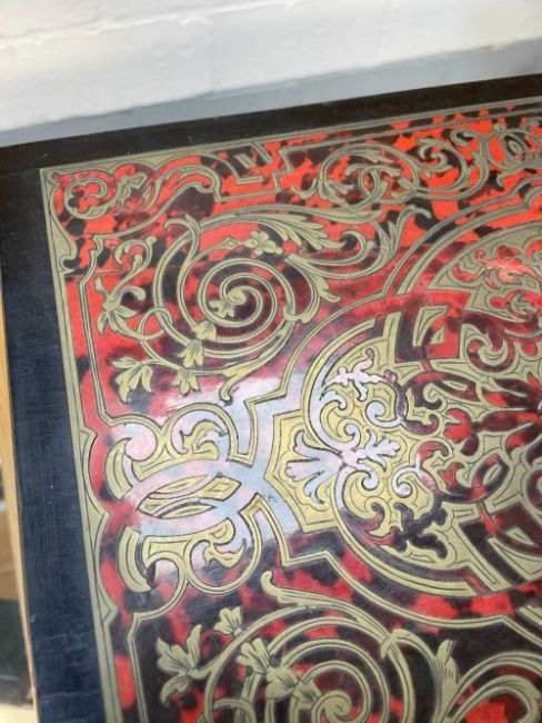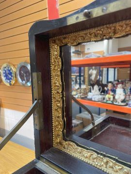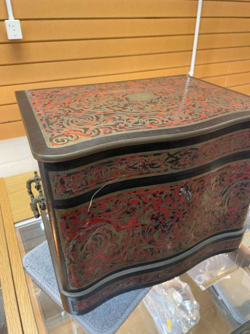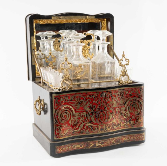 19TH C. FRENCH RED TORTOISESHELL BOULLE SERPENTINE DECANTER BOX, mirror-back hinged lid opening to reveal rise-action table supporting gilt brass mounted lift-out frame with 4-decanter set and 8 liqueur glasses, 28 (h) x 36 (w) x 26cms (d)Provenance: private collection CardiffComments: some brass inlays loose/missing, lock and action stiff, 2 feet missing.