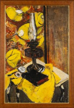 ‡ GWILYM PRICHARD (1931-2015) oil on canvas - still life of oil lamp, book, pipe on table, signed, 75 x 50cmsProvenance: private collection ConwyComments: framed, ready to hang