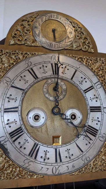 GEORGE II STYLE 8-DAY LONGCASE CLOCK, later brass dial with silvered chapter ring bearing date '1736', strike/silent on the arch, subsidiary seconds dial, in later mahogany case, 225 (h) x 47 (w) x 23cms (d)Provenance: consigned via CardiffComments: alterations, adaptions, later replacement dial with false calendar and spurious date, strike/silent not articulated, foot loose, inspection advised