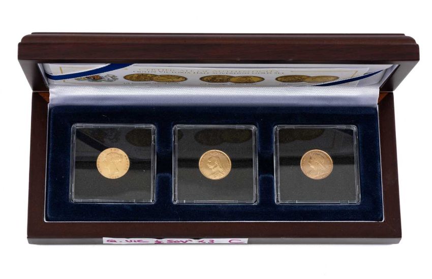VICTORIA GOLD HALF SOVEREIGN 3-COIN SET, Windsor Mint limited edition (543/999), containing 1849 young head, 1892 jubilee head, and 1898 veiled head coins, all encapsulated with COAs in English and German, in case of issue, outer card boxProvenance: deceased estate CardiffComments: excellent