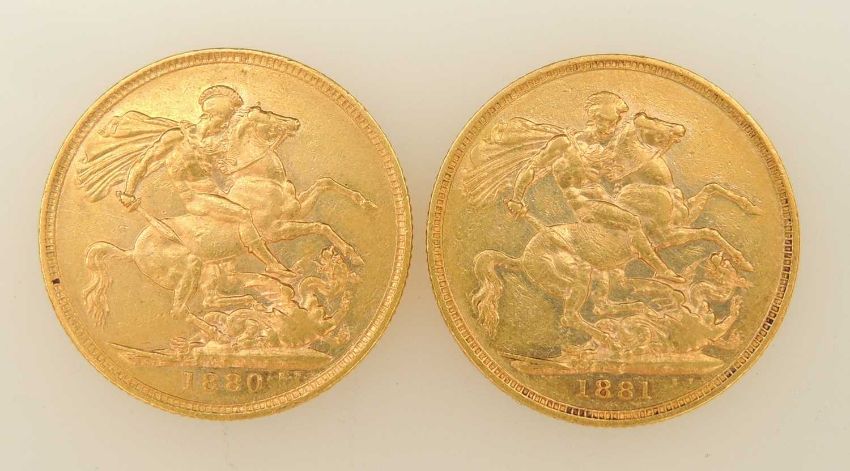 VICTORIA, TWO SOVEREIGNS, 1880, Young Head, Sydney Mint (EF), 7.98g; and 1881, Young Head, Melbourne Mint (VF/EF), 7.98g (2)Provenance: private collection Cheshire