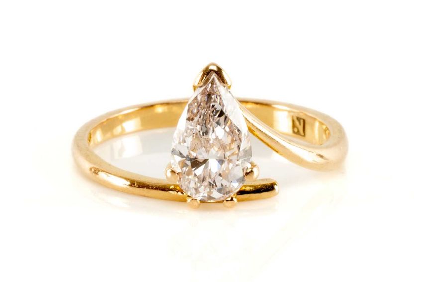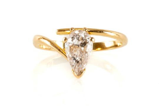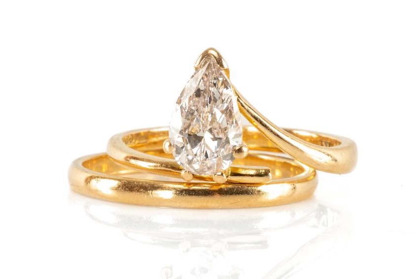 18CT YELLOW GOLD NATURAL LIGHT PINK DIAMOND RING, the brilliant pear-cut diamond measuring 1.0cts, ring size N-O, 2.5g, together with 18ct yellow gold plain wedding band, size O, 1.8g (2)Provenance: private collection Bridgend Comments: with GIA lab report stating 'Color Natural, Light Pink, Clarity VS2, Cut Good', dated 2001