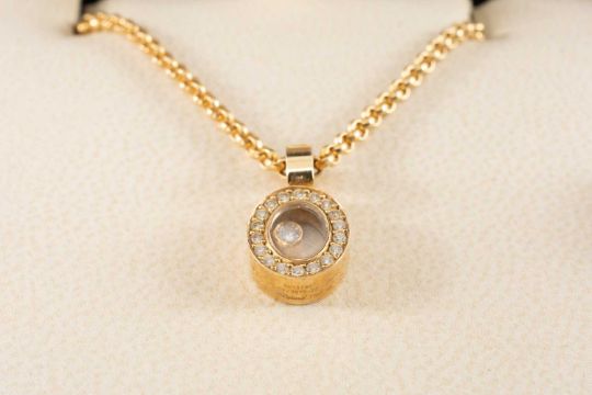 CHOPARD 18CT GOLD 'LUCKY DIAMONDS' PENDANT NECKLACE, oval window pendant with diamond border containing loose solitaire, in case of issue, 11gProvenance: private collection Cardiff
