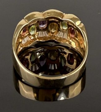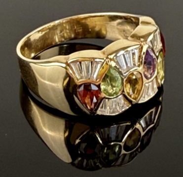 DECORATIVE MULTICOLOURED GEM-SET & CUBIC ZIRCONIA DRESS RING, in 18ct gold, set with pear-cut garnets, amethyst, citrine, peridot, dispersed with baguette cut cubic zirconia, indistinctly marked, size P, approx. 7.1gProvenance: private collection Shropshire