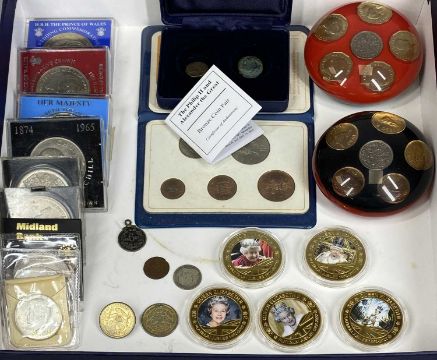 COLLECTION OF COINS, including Philip II and Alexander the Great bronze coin pair, 382-323 B.C., Westminster Mint case; various commemorative crowns; Britain's first decimal coin set; two-coin set; paperweights, etc.Provenance: private collection Conwy