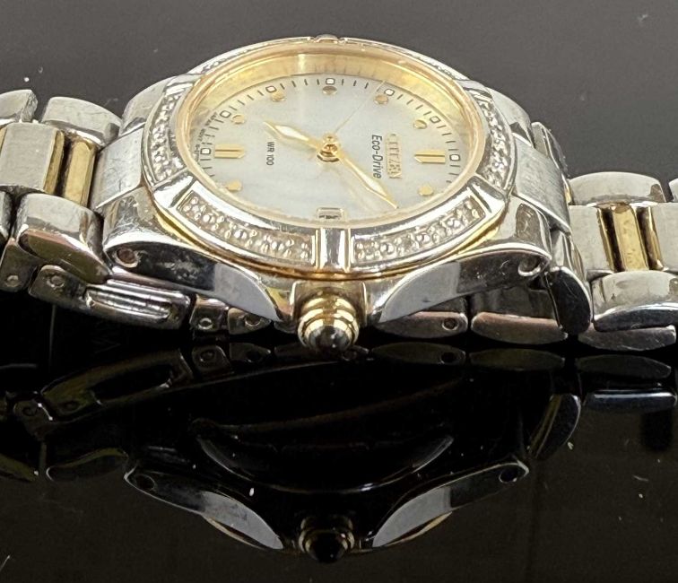 CITIZEN 'ECO-DRIVE' LADIES' QUARTZ STAINLESS STEEL WRISTWATCH with mother of pearl dial and date aperture, diamond-set bezelProvenance: deceased estate ConwyComments: currently ticking