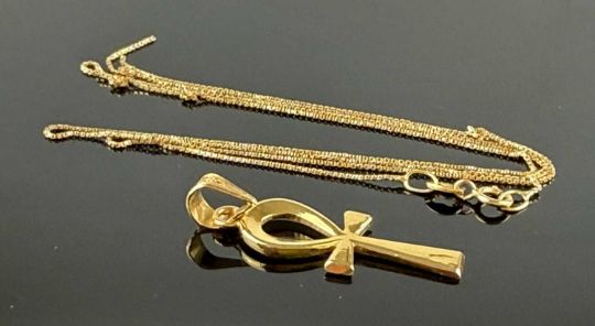 EGYPTIAN GOLD ANKH PENDANT, unmarked testing as 18ct, 28mms (l), 2g, together with 18ct gold fine box chain necklace, 1.3g (2)Provenance: private collection GwyneddComments: box chain necklace damaged