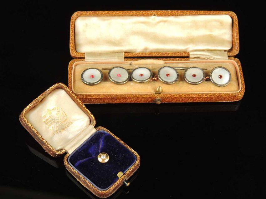15CT GOLD & DIAMOND SHIRT STUD, old round-cut stone approx. 0.10ct, 1.2g; also cased set of gilt and mother of pearl dress buttons and cufflinksProvenance: private collection Wrexham