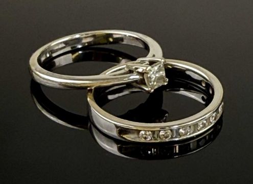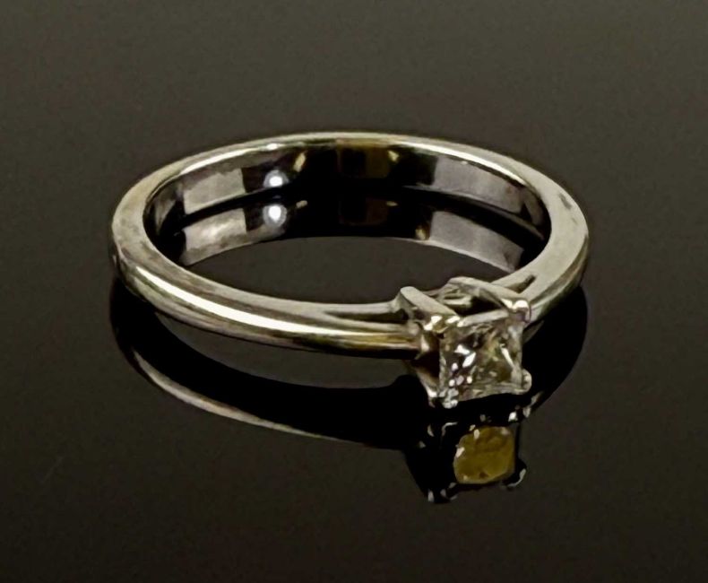 DIAMOND SOLITAIRE RING set with princess cut diamond of approx. 0.33ct on an 18ct white gold ring, size P, 3.2g, together with an 18ct white gold & diamond half eternity ring, set with nine small brilliants, size O, approx. 2.8g (2)Provenance: private collection Cheshire