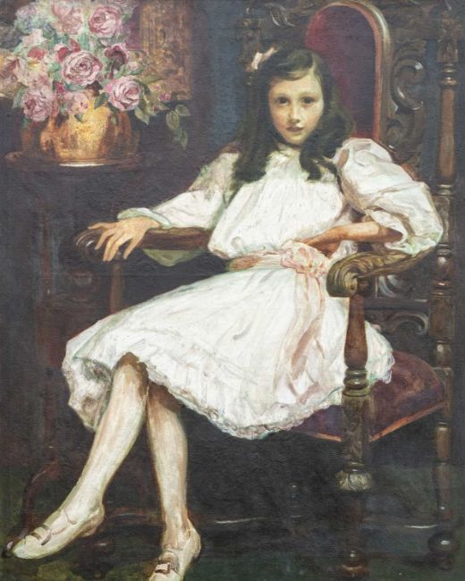 CHRISTOPHER WILLIAMS RBA fine and large oil on canvas - untitled portrait of a ten year old girl sat in a chair in a summer dress next to a vase of flowers, dated to 1910, 125 x 100cmsProvenance: portrait of the vendor's grandmother Mary Lloyd, the artist also painted Mary's two sisters and the portrait of one sister, Constance, was believed to have been exhibited at the National Portrait Gallery, private collection Cardiff, by descentComments:good large gilt frameLater Note: painting of Constance was exhibited at the Royal Society of British Artists in 1911, painting now held at the National Library of Wales, Constance married Ernest Evans (1885-1965), Judge of County Courts and politician. He was the private secretary to Lloyd George (and there is a portrait of Lloyd George by the artist in this auction). Mary and her two sisters were daughters of a Thomas Lloyd, draper, of Hadley Wood believed to have died when they were young. Their widowed mother then married J.T. Lewis of London and Llanarth, Cardiganshire. He (J.T. Lewis) appears to have been described as a "popular London Welshman".
