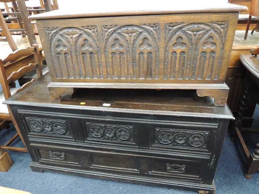 VICTORIAN CARVED OAK MULE CHEST, 62 (h) x 126cms (w), and a Gothic carved oak coffer / blanket chest, 94cms (w)Provenance: private collection Cheshire