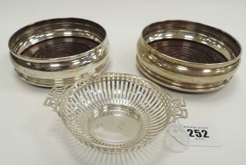 SILVER PIERCED BONBON DISH, Sheffield 1912, 50g, and pair of silver-plated bottle coasters (3)