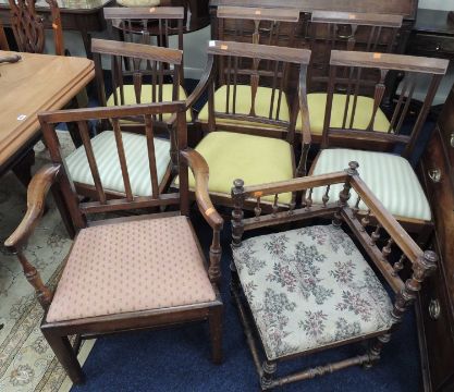 SET OF SIX LATE GEORGE III MAHOGANY DINING CHAIRS, comprising five singles and one carver, also a similar period provincial fruitwood open armchair and a Victorian corner chair (8)