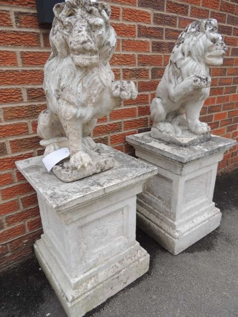 PAIR OF RECONSTITUTED STONE GARDEN LIONS, on square plinths, 120cms (h)Provenance: private collection Cheshire