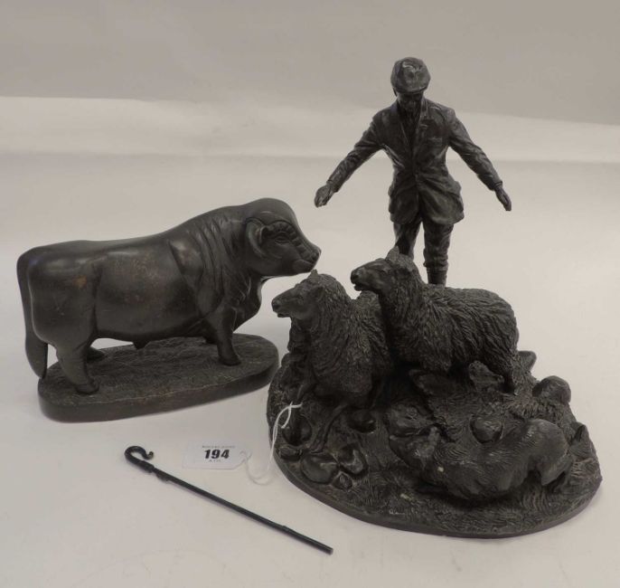 STYLISED BRONZE FIGURE OF A BULL, 23.5cms, and Heredities figure group of a shepherd (2)Provenance: private collection Cheshire