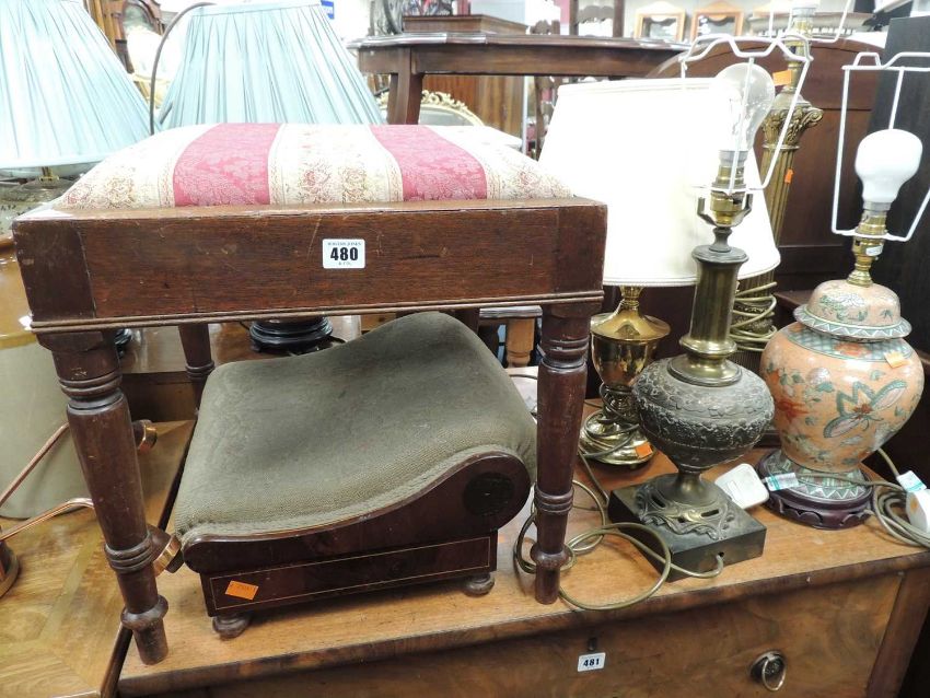 MAHOGANY DRESSING STOOL, also a Victorian mahogany and inlaid footstool and four table lamps (6)