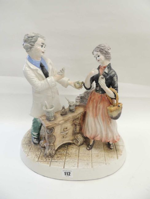 BRUNO MERLI CAPO-DI-MONTE MODEL of a pharmacist and customer at the counter, oval base, 35cms (h)Provenance: private collection Cheshire