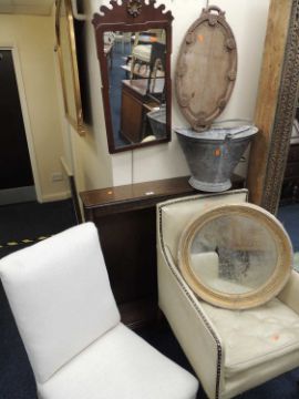 FURNITURE PARCEL, comprising Edwardian upholstered tub chair, Victorian upholstered nursing chair, Victorian gilt framed circular wall mirror, oak open bookcase, carved wooden tray, further wall mirror, and a galvanised pail (7)