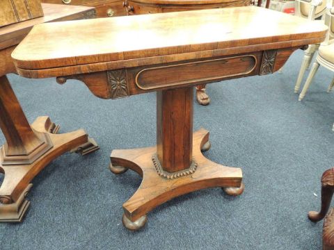 LATE REGENCY ROSEWOOD FOLDING PEDESTAL CARD TABLE c. 1820, 78 (h) x 90.5cms (w)Provenance: private collection Wrexham