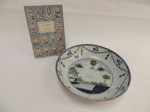 LONDON DELFT 'LUNARDI' BALLOONING PLATE, Lambeth circa 1785, finished in blue, green and manganese (repaired and rim chip), 22.5cm diameter; accompanied by 'Ballooning', a Penguin Books publication by C H Gibbs-Smith, published 1948 (2)