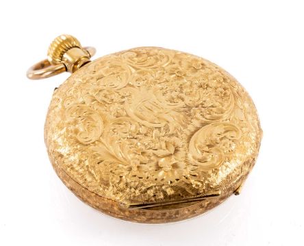 18K GOLD FANCY FOB WATCH, open face, circular gilt dial with Roman numerals, scroll and foliate engraved, top-wind, 36.2gmsProvenance: private collection PembrokeshireComments: light wear overall, not ticking currently, viewing recommendedPlease note: this lot located at our Cardiff auction house for viewing. For condition reports please email lotenquirysw@rogersjones.co.ukAll purchased lots in this auction can be transferred to any one of our five offices providing payment terms are met first. Please see terms.P&P available on request (maximum insurance value £2,500) – please contact the office for a quote.
