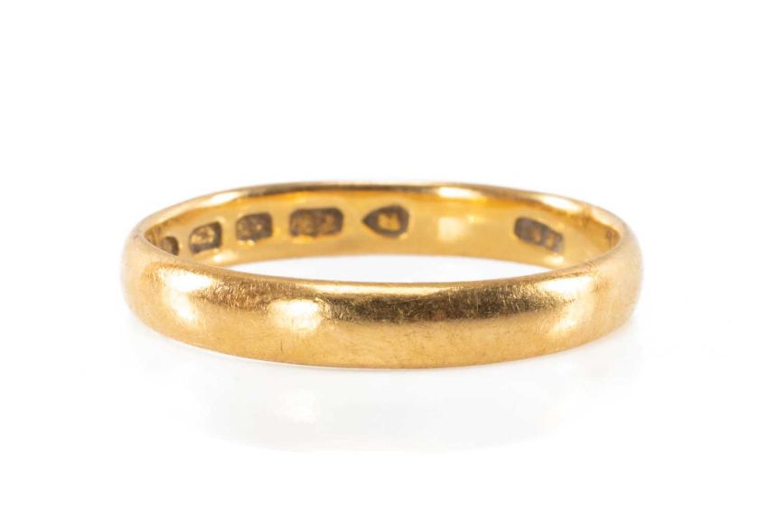 22CT GOLD WEDDING BAND, ring size M, 2.4gmsProvenance: private collection CeredigionComments: light wear overall commensurate with age / use, viewing recommendedPlease note: this lot located at our Cardiff auction house for viewing. For condition reports please email lotenquirysw@rogersjones.co.ukAll purchased lots in this auction can be transferred to any one of our five offices providing payment terms are met first. Please see terms.P&P available on request (maximum insurance value £2,500) – please contact the office for a quote.