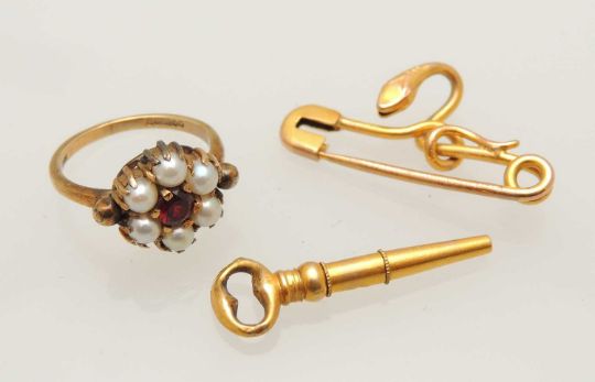 9CT GOLD GARNET & PEARL DRESS RING, size J, 3.1g; gold coloured serpent bar brooch, indistinctly stamped 'ct', 2.2g; and Victorian gold coloured watch key (3)Provenance: private collection FlintshirePlease note: this lot located at our Chester auction house for viewing. For condition reports please email lotenquirynw@rogersjones.co.ukAll purchased lots in this auction can be transferred to any one of our five offices providing payment terms are met first. Please see terms.P&P available on request (maximum insurance value £2,500) – please contact the office for a quote.
