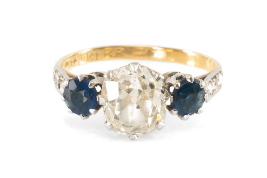 ANTIQUE DIAMOND & SAPPHIRE THREE-STONE RING, central old cut diamond approx. 1.5ct (7.5 x 6.8 x 4.5mm), flanked by small bright sapphires, diamond chip shoulders, gross wt. 2.7g, ring size LProvenance: private collection Bridgend County BoroughComments; one shoulder diamond missing. Principal diamond with inclusions and crackPlease note: this lot located at our Cardiff auction house for viewing. For condition reports please email lotenquirysw@rogersjones.co.ukAll purchased lots in this auction can be transferred to any one of our five offices providing payment terms are met first. Please see terms.P&P available on request (maximum insurance value £2,500) – please contact the office for a quote.