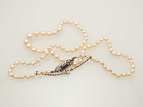 CULTURED PEARL SINGLE-STRAND NECKLACE, largest pearl 8mms (diam.), graduating in size to approx. 4mms (diam.), united by a metal clasp centred with a synthetic sapphire and inset with tiny rose diamonds, with safety chain, 54cms (l)Provenance: private collection ConwyPlease note: this lot located at our Chester auction house for viewing. For condition reports please email lotenquirynw@rogersjones.co.ukAll purchased lots in this auction can be transferred to any one of our five offices providing payment terms are met first. Please see terms.P&P available on request (maximum insurance value £2,500) – please contact the office for a quote.