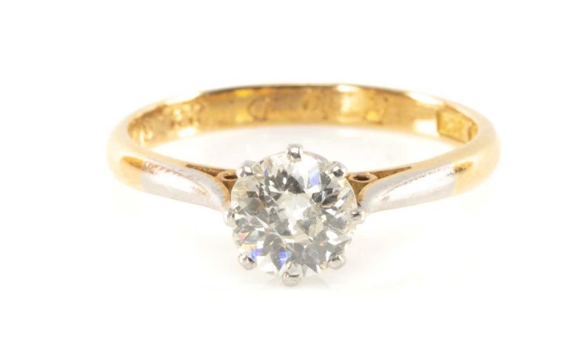 18CT GOLD & PLATINUM DIAMOND SOLITAIRE RING, the single old cut, claw-set stone measuring 0.7cts approx., ring size M 1/2, 2.6gms in Percy Company of Regent Street, London ring boxProvenance: private collection CarmarthenshireComments: light wear overall commensurate with age / use, inclusions / black mineral deposits to 'table' , colour I / J, clarity Pi, views are subjective and not a guarantee, viewing recommendedPlease note: this lot located at our Cardiff auction house for viewing. For condition reports please email lotenquirysw@rogersjones.co.ukAll purchased lots in this auction can be transferred to any one of our five offices providing payment terms are met first. Please see terms.P&P available on request (maximum insurance value £2,500) – please contact the office for a quote.