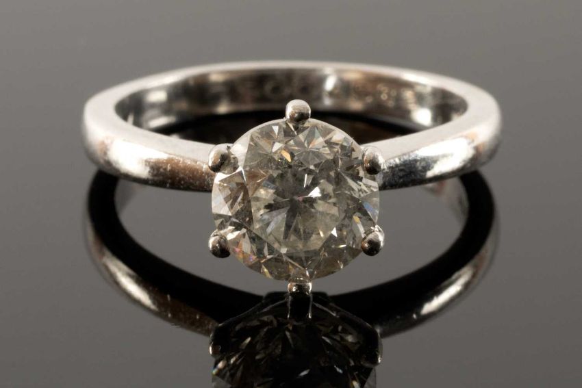 18CT WHITE GOLD DIAMOND SOLITAIRE RING, the single claw set round cut diamond measuring 1.5cts approx., ring size N, 5.4gmsProvenance: private collection Cardiff, by descentComments: Clarity Si, Colour I / J, inclusions, wear commensurate with age / use, opinions are subjective and not a guarantee, viewing recommendedPlease note: this lot located at our Cardiff auction house for viewing. For condition reports please email lotenquirysw@rogersjones.co.ukAll purchased lots in this auction can be transferred to any one of our five offices providing payment terms are met first. Please see terms.P&P available on request (maximum insurance value £2,500) – please contact the office for a quote.