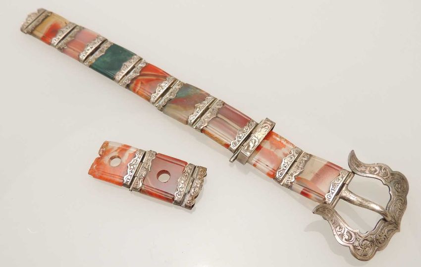 VICTORIAN SCOTTISH AGATE BELT FORM BRACELET, late 19th century, with ten square cut agates mounted in foliate engraved silver, 20.5cms (l)Provenance: private collection ConwyComments: with damages and one agate deficientPlease note: this lot located at our Chester auction house for viewing. For condition reports please email lotenquirynw@rogersjones.co.ukAll purchased lots in this auction can be transferred to any one of our five offices providing payment terms are met first. Please see terms.P&P available on request (maximum insurance value £2,500) – please contact the office for a quote.