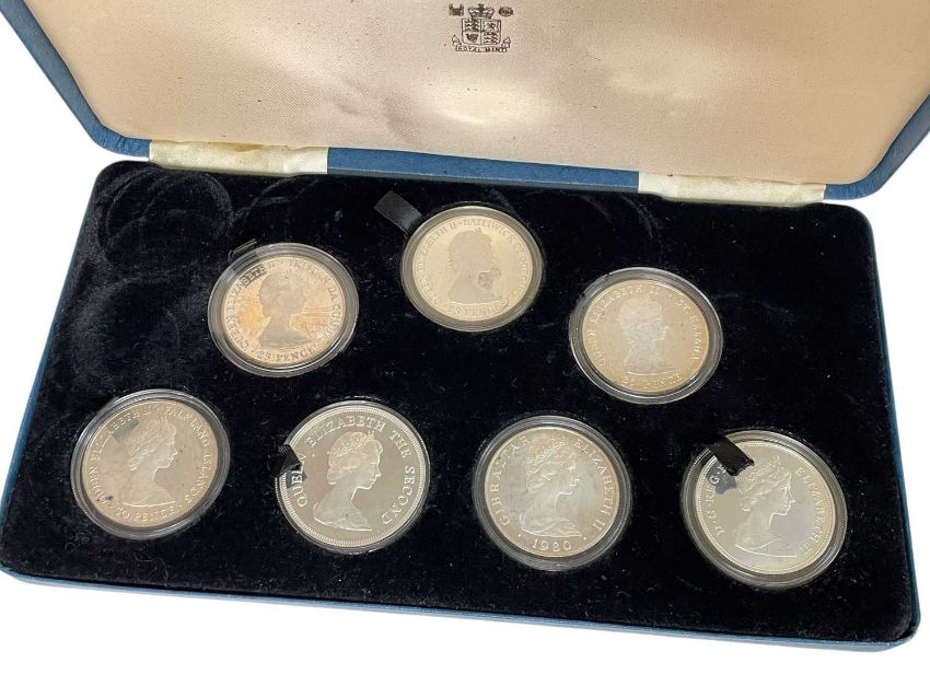 QUEEN MOTHER 80TH BIRTHDAY 7-COIN SILVER PROOF CROWN SET, 1980, six weighing 28.276g, one weighing 35.0g, with COA in case of issueProvenance: private collection Dorset.Comments: very goodPlease note: this lot located at our Cardiff auction house for viewing. For condition reports please email lotenquirysw@rogersjones.co.ukAll purchased lots in this auction can be transferred to any one of our five offices providing payment terms are met first. Please see terms.P&P available on request (maximum insurance value £2,500) – please contact the office for a quote.
