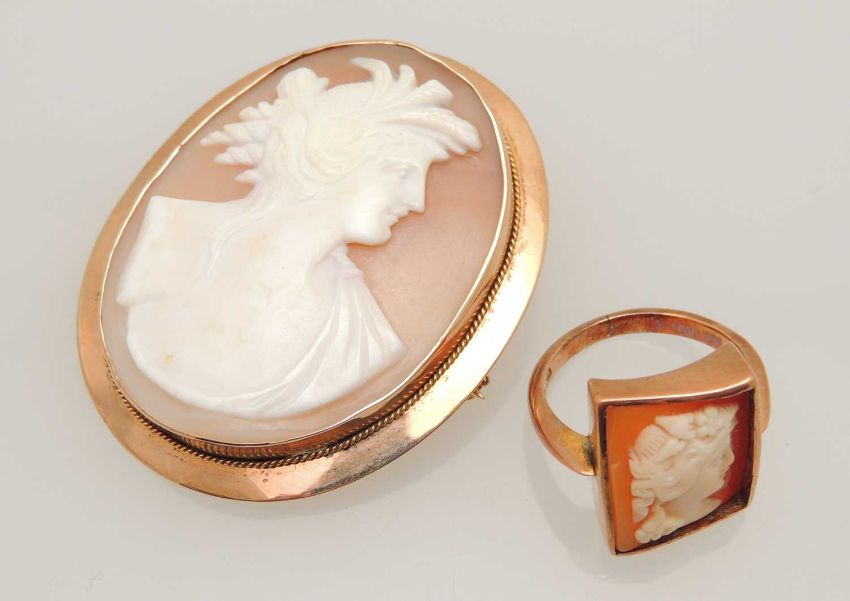9CT GOLD CAMEO RING, size P, 5.8g, and 9ct gold mounted carved shell cameo brooch, 51 x 42mms, 14g (2)Provenance: private collection CheshirePlease note: this lot located at our Chester auction house for viewing. For condition reports please email lotenquirynw@rogersjones.co.ukAll purchased lots in this auction can be transferred to any one of our five offices providing payment terms are met first. Please see terms.P&P available on request (maximum insurance value £2,500) – please contact the office for a quote.