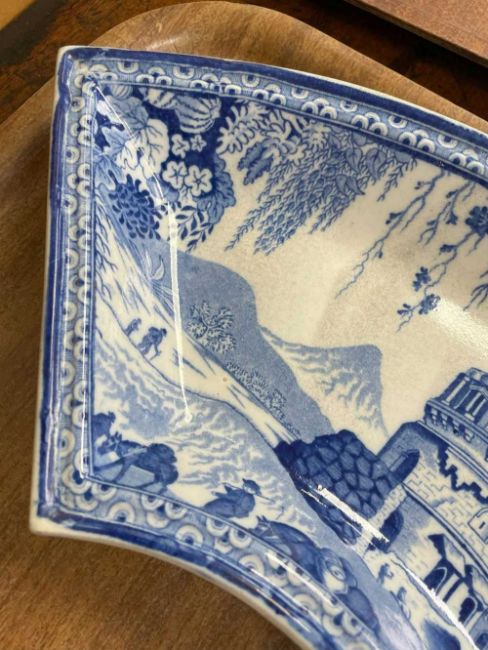 SWANSEA CAMBRIAN POTTERY 'MONOPTEROS' blue and white transfer pattern centre supper-tureen together with two matching curved side-dishesProvenance: private collection CeredigionComments: repair to knop, clips/nibbles to tureen, please examine