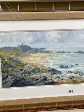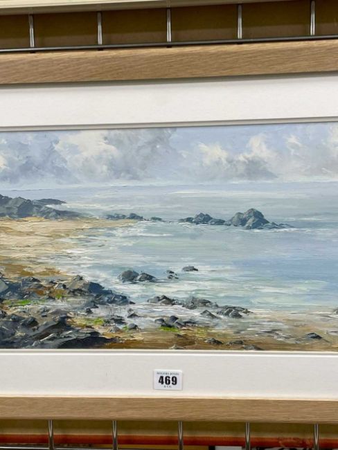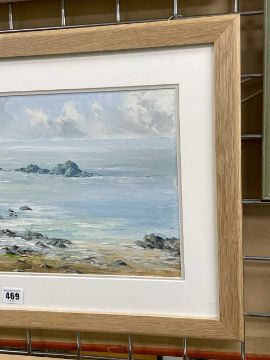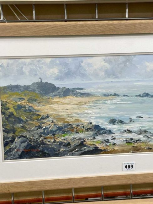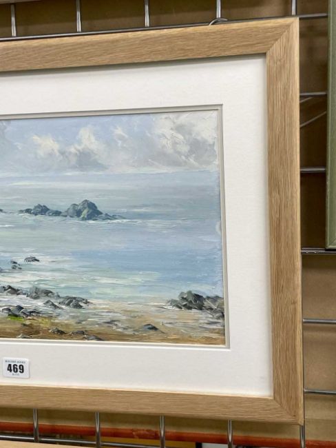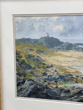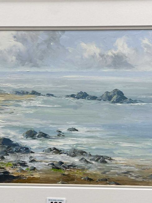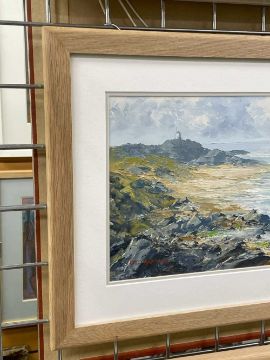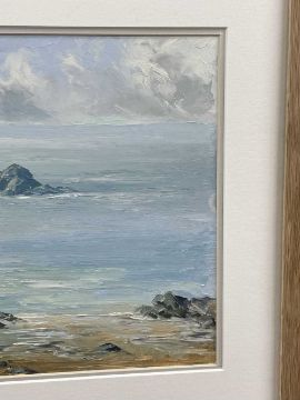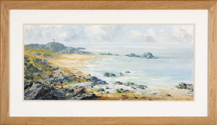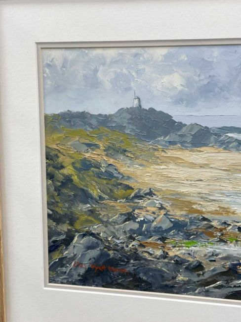 ‡ CHARLES WYATT WARREN oil on board - Llanddwyn from Traeth Penrhos, Ynys Môn (Anglesey), signed, 25 x 55cmsProvenance: private collection ConwyComments: framed and glazed Condition Report:under non-reflective UV glass