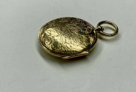 VICTORIAN GOLD PICTURE LOCKET, finely engraved with a running stag and foliate scrolls, probably continental, with a glass interior cover, unmarked, testing as a minimum 9ct, 28mms (diam.), 13.9gProvenance: private collection Chester