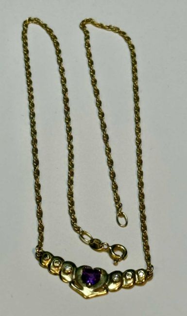 AMETHYST & DIAMOND SUITE, including pendant necklace in 9ct gold, the pendant centred with pear-cut amethyst, flanked by tiny round-cut diamonds on rope twist necklace, 43cms (l), 4.9gms, matching ring, size N, 2.4gms and pair of matching earrings, approx. 2gms (4)Provenance: private collection Conwy