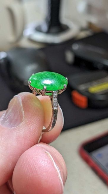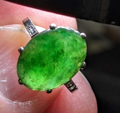 JADE & DIAMOND RING, oval cabochon jade stone 14 x 10mm, with 6 small diamonds at the shoulder, unmarked white metal, ring size I, 2.7gProvenance: private collection Vale of GlamorganComment: good overall, stone of even mottled mid-green colour, see additional images.