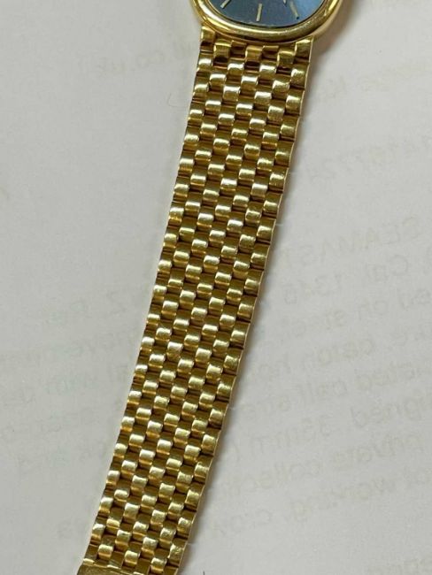 18CT GOLD PATEK PHILIPPE 'ELLIPSE' WRISTWATCH, blue dial with baton hour markers, 18ct gold integrated brick-link bracelet with clasp, stamped '750', 52.9gmsProvenance: deceased estate CarmarthenshireComments: light wear overall commensurate with use / age, not ticking, crown loose, viewing highly recommendedNote: this item is available to view at our Cardiff Saleroom by appointment up until 5pm, Tuesday 2nd September, viewings in Chester thereafter.