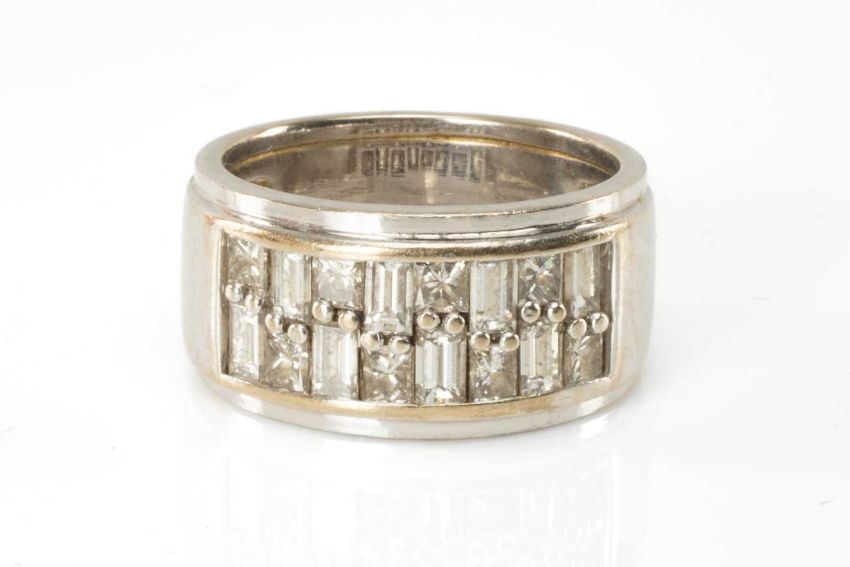 18K WHITE GOLD & DIAMOND GENT'S RING, collet set with double row of alternating princess and baguette cut diamonds, stamped '750 18k', gross wt. 11.5g, ring size N/OProvenance: private collection Vale of GlamorganComments: ordinary wear